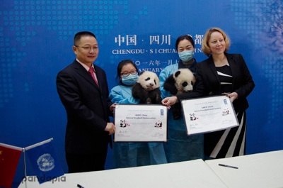 仪式上确立了大熊猫庆贺的双胞胎为‘UNDP形象大使’,并启动“UNDP形象大使”全球征名暨“UNDP熊猫使者”全球招募活动。同时拉开了大熊猫之歌的征集活动及大熊猫全球巡展的帷幕。