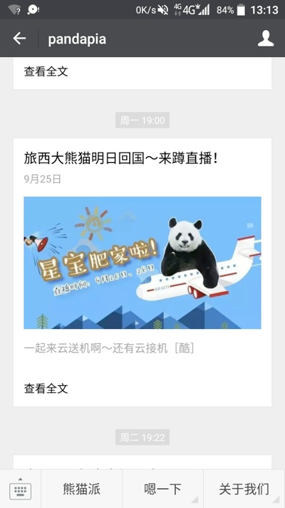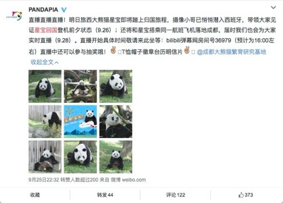 28日下午,出生在西班牙馬德里並度過了4年多美好童年的大熊貓“星寶”回到了他父母的故土-四川成都。25日Pandapia在馬德里動物園對星寶進行了現場直播,28日在成都雙流國際機場直播了星寶回國現場。兩場直播均引起網友極大關注,特別是9月28日回國當日,嗶哩嗶哩彈幕網上的pandapia官方直播間最高線上人數達3.5萬人。