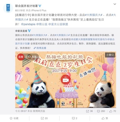 9月15日 ,聯合國駐華協調員、聯合國開發計劃署駐華代表羅世禮先生及夫人前往成都熊貓基地為啟啟點點慶祝兩歲生日,並親手為兩位形象大使制作了生日蛋糕。為此pandapia對此事件進行了全程直播,3小時內共計30萬人瀏覽觀看,嗶哩嗶哩彈幕網的pandapia官方直播間最高在線人數達3.5萬人。